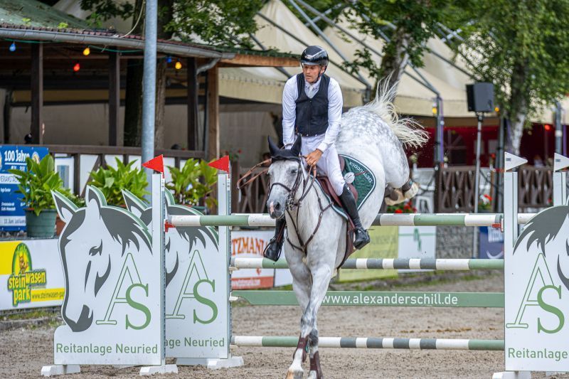 Obwohl „Hansi“ Dreher seit Jahrzehnten Stammgast beim Ichenheimer Turnier ist, gehörte es in diesem Jahr nicht zu seiner Turnierplanung. Da er seit Monaten mit „Elysium“ zum Olympiakader gehört, ging er davon aus, dass er beim zeitgleichen CSIO in Rotterdam starten würde. Als er für dieses Turnier nicht nominiert wurde, nannte er in letzter Minute für die Starts auf der Waldreitanlage nach, wo er dann mit verschiedenen Pferden souverän auftrumpfte. „Das war ein Hammerspringen, die Zuschauer haben heute abnormalen Sport gesehen“, meine er bei der Siegerehrung, nachdem er mit dem großrahmigen Schimmel „Cous Cous“ den Großen Preis von Neuried und der Sparkasse Offenburg/Ortenau gewonnen hatte. Lokalmatador Alexander Schill, der 2022 den Großen Preis gewonnen hatte und wie Dreher zwei Pferde ins Stechen bringen konnte, war mit „Exklusive“ nur einen Wimpernschlag langsamer und wurde Zweiter.